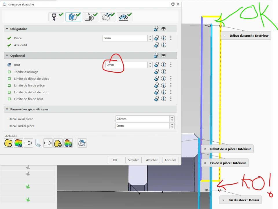 I have a cylindrical part with à hole and i want to make a "ROUGH" operation in "Frontal" mode...so for safety i increase the rough with 2mm. In Extern : the offset in X+ and Z+ it is OK. But in the hole, the profile is offset with 1mm in X+ so in a wrong way...