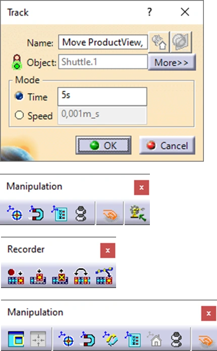 When this function was selected, the user was asked to select Products and/or Resources and with the Recorder toolbar, the user recorded positions of the selected objects with the compass (which is attached to the selected objects)