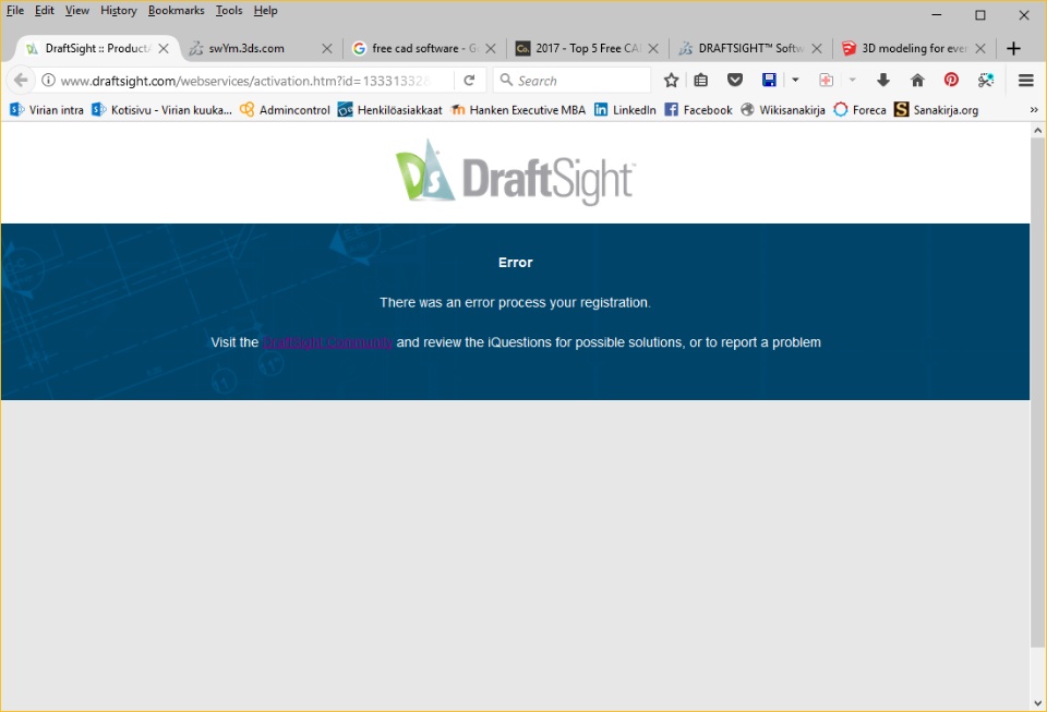 I have been using Draftsight for private purposes for years. Renewal of registration has worked fairly well so far, but now a renewal is required again. It just doesn't work. I even updated the sw totally, it's now 2017 SP3. I have received the registration email fine, but the link ends up to an error page everytime. I have tried with several email addresses even. The result is the same everytime. What can be wrong? The error page looks like this: