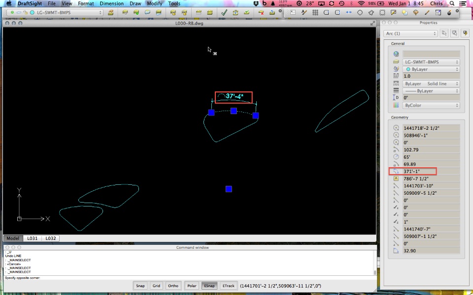 I have discovered that some of the arcs give an incorrect Arc Length in the Properties panel. The length for the inverse portion of the arc that is not drawn (not showing) is given in the Properties panel (ARC-02). The problem becomes very evident when I import a DXF of the file into GIS (ARC-03). GIS draws the inverse portion of the arcs that gave an incorrect Arc Length in the Properties panel in DS.