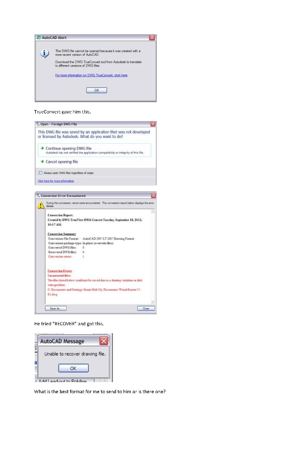 My son is using AutoCAD 2007 so I sent him a file R2007-2009.dwg. He gets the following messages as uploaded.