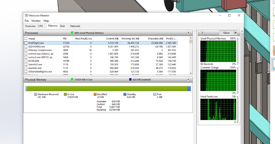 Draftsight is accumulating memory usage after opening plenty of files. Closing the files does not release the memory. After a while everything starts working slow. Mouse is moving at a rate of like 2 fps, working within draftsight is slow etc... then at some point it crashes.
