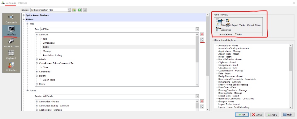 I'm looking at "Customize" and I'm noticing that the Panel Preview has overlapping information. Regardless of what I select for Tabs or Panels, the Panel Preview shows "Annotations" right behind the panel I'm previewing.