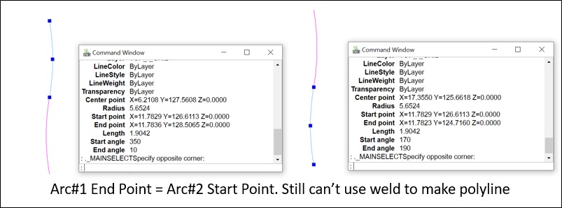 I recently update from Draftsight 2019 to 2023 SP0 Version and I have problem that sometime I have to "explode" arc polyline into multiple arc lines, but I can't "weld" them to make it polyline again. I have to move end point of Arc#1(In the picture) to somewhere and move back to same position to make it able to "weld".