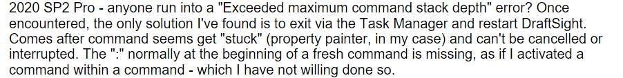2020 SP2 Pro - anyone run into a "Exceeded maximum command stack depth" error? Once encountered, the only solution I've found is to exit via the Task Manager and restart DraftSight. Comes after command seems get "stuck" (property painter, in my case) and can't be cancelled or interrupted. The ":" normally at the beginning of a fresh command is missing, as if I activated a command within a command - which I have not willing done so.