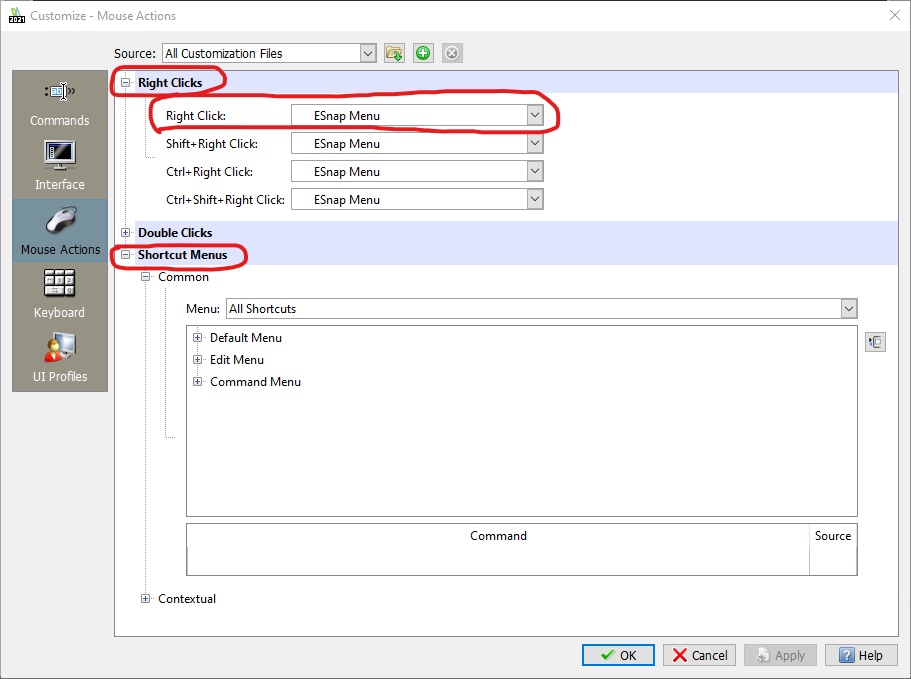 To navigate to the menu I'm referring, type the command CUSTOMIZE, select Mouse Actions, and then expand Right Clicks and Shortcuts Menus.