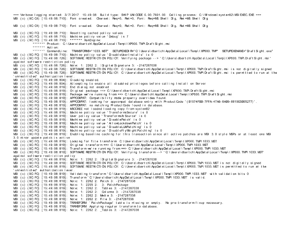 Applied hot fix to my 2015 version. Everything was ok until I decided to install the 2017 version. DraftSight 2017 SP1 64-bit installer gives 1722 error when it tries to register FxVistaPreview.dll and the only option is to undo the installation. Now I cannot reload the old 2015 version either. After trying many things, I and my IT department are stumped. There seems to be a library dependency referenced by this dll that regsvr32.exe cannot reconcile. Has anyone else had this issue or know of a solution? My OS is Windows 7 Professional 64-bit. Installer log file is attached.