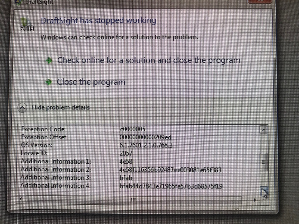 got the new draftsight professional, been using it since december and the last couple of weeks its been crashing randomly and slowly crashing more often and today it crashed 6 times. You cant even force close the program, you have to completely shutdown the computer. Ive attached 2 screenshots of the error details if anyone can understand it. Theres nothing specific im doing thats causing a crash.