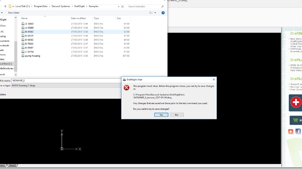 Hi when I try and save a project or even just a blank project I can as it comes up with a message "The program Must close before the program closes you can try to save changes in c:\\Program Files\\Drafsight systenes\\Draftsight\\bin\\NoNAME_0_Recover_2017-04-04.dwg any changes that are saved are those prior to the last command you used do you want to save changes" when I click yes it just crashes all to gather I can navigate to that path but no save file is there and the only thing I did at lunch is just click save