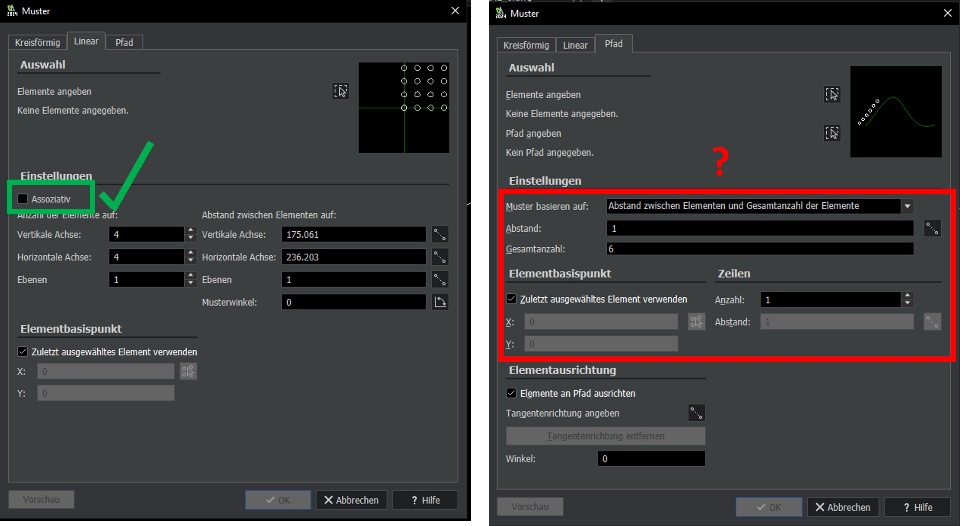 2.) Does Draftsight provide in any way the possibility to create assoziative path patterns? I want to be able to change the number of elements and their distances without being dissolved. I saw that linear pattern provides the possibility of associative modification. (see attached file "patterns.jpg")