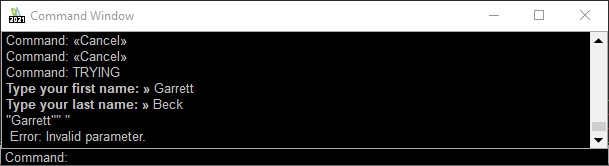 ;; User Interaction (setq sfName (getstring "\\nType your first name: ")) (setq slName (getstring "\\nType your last name: "))