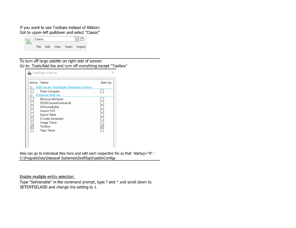 Since I'm signing off for now, I thought I'd share a small sampling of the various settings I discovered in my journey to tweak DraftSight. I hope it is of some value to the users in this forum.