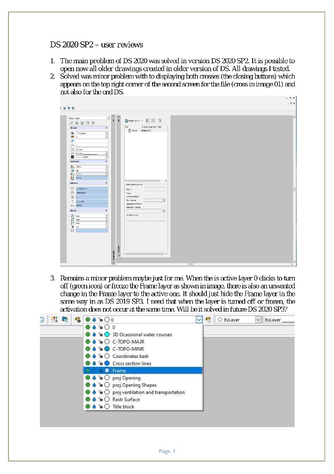 The main problem of DS 2020 was solved in version DS 2020 SP2. It is possible to open now all older drawings created in older version of DS. User reviews arising from short-term testing can be found in Annex. This review has been sent to the support. Any other tips?