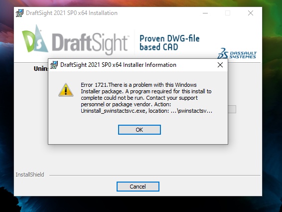 i currently have two issues with draftsight. I am currently getting an error 1721. When I go to uninstall the software to start over, I get "activation prerequisite is missing, please reinstall (68). I cannot reinstall because of the error 1721. Please assist me with this issue. Thanks