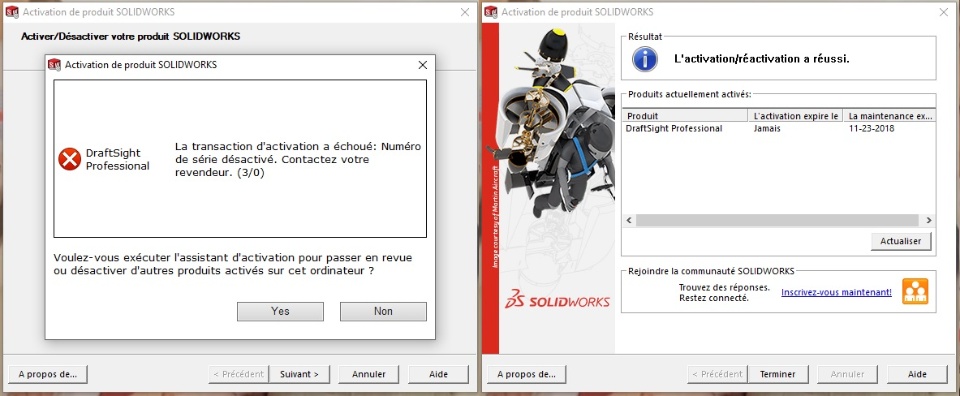 Hi, I've bought 6 licences of Draftsight Professionnal in Nov 2017. I could have activated them on each computer. Since this date, some computers have been changed, the licence was desinstalled before being reinstalled on the new PCs. We had no problems. But, 6 monthes ago, we processed as usual and we had some troubles on 1 machine. The licence is recognized by Draftsight, but the program still demands an activation. We process as requested before always getting an activation error from Solidworks. We close the popups and Draftsight appears. How can we fix that ?