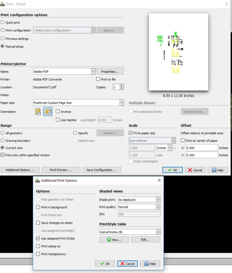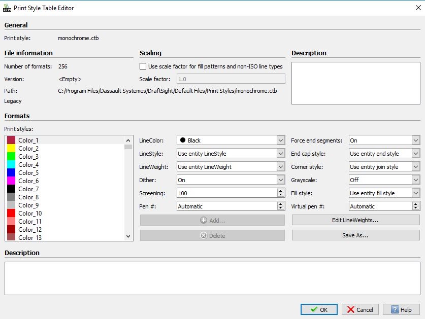 I am having issues with lines/arcs/circles and some text printing light. I am using DraftSight Standard version 2019 x64 SP1. I am using the monochrome.ctb print style table (see default settings picture). This setting only changes the dimensions and some text black in the preview screen and when printing. I get the same result on a black and white laser printer, printing to PDF (see print configuration settings below) and a color laser printer which I set to black and white. What do I need to do to print all elements in the drawing black instead of light grey?