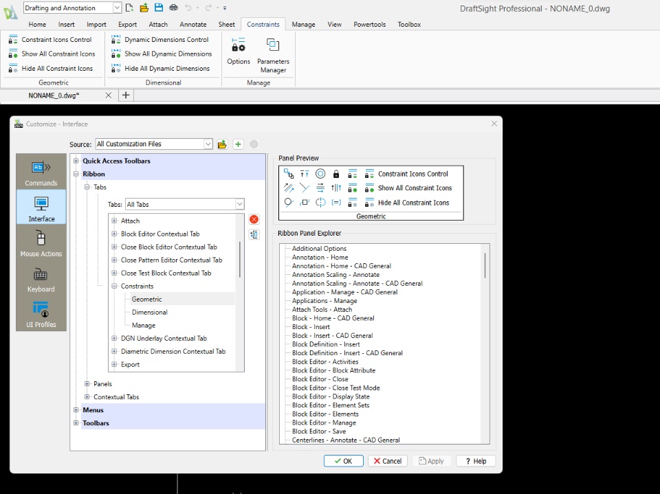 I went to edit a file, and all the constraints icons were missing from the toolbar. All I see are the hid and show icons (see attachment). I tried reinstalling, and I tried upgrading to 2024 SP0, deleting the configuration folders in %appdata% and none of this fixed the issue. When I try to customize the interface > ribbon > tabs > constraints > geometric, I see all the icons that should be there.