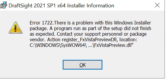 Please advise I having this error while installing draft sight 2021 sp1, error screenshot as at ...