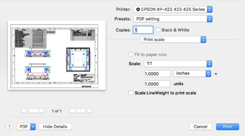 When I try to save my work as a PDF file, the preview in the print window looks perfect, but when I click "PDF - Save as PDF" the PDF file comes out with a tiny drawing in the bottom left hand corner.