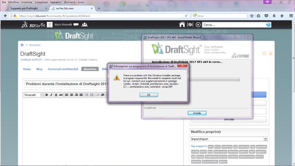 Ho correttamente installato e attivato Draftsight, tant'è che per 1/4 d'ora sono riuscito ad utilizzarlo. Poi ad un certo punto mi è comparso un messaggio che mi richiedeva di riavviare il PC per completare l'attivazione oppure di farlo più tardi. Io ho cliccato sul "rimanda" ed il programma si è istantaneamente chiuso e non sono più riuscito a riavviarlo.