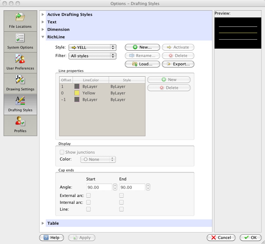 I am using DraftSight for Mac, V1R1.3. I have created a new RichLine Style (Options > Drafting Styles > RichLine) and have exported it to the RichLine Styles folder using the same name for the filename as for the RichLine Style itself (The Export function automatically appends an ".mln" suffix to the filename.) and I have made my newly defined RichLine Style active (click "Activate" button). I can now go to the drawing window and create a RichLine using the newly defined RichLine Style. However, if I then want to modify the RichLine Style (Options > Drafting Styles > RichLine), none of the options are enterable. The Line Properties section is greyed out and the New and Delete buttons are dimmed, and the Display and Cap Ends dialogs are also disabled. The only way I can modify the RichLine Style is if I first delete the RichLine I drew in the drawing window. Thank you for your attention to this issue.