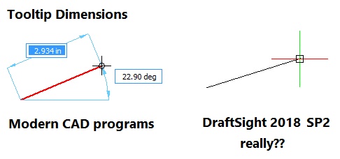I am new to Draftsight, may be I'm missing something. But I am SHOCKED to see lack of tooltip dimensions in DS 2018. If you can't implement it as a popup (too difficult may be), have it on the side in properties window or something. I cannot imagine being productive with DS without this most basic feature.