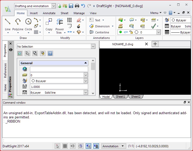 At program start with no existing drawing file specified the Command window shows a complaint "An unsigned add-in, ExportTableAddin.dll, has been detected, and will not be loaded. Only signed and authenticated add-ins are permitted."