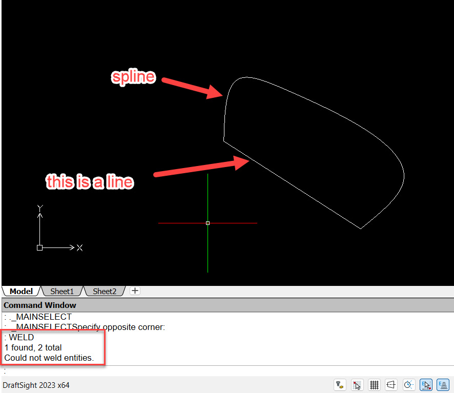 I would like to weld (join) two elements in Draftsight: a line and a spline, but I could not (see image).