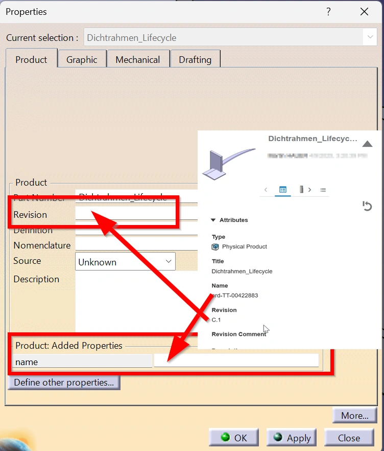 CATIAV5 allows you to export parts and assemblies using the EXPORT function. However, if several releases are exported, the recipient has no way of distinguishing which release he is currently working on. It would therefore be helpful to map the attributes "Name and "Revision" in the properties of the CATIAV5 parts and assemblies.