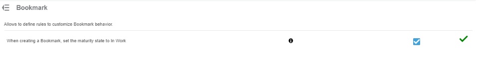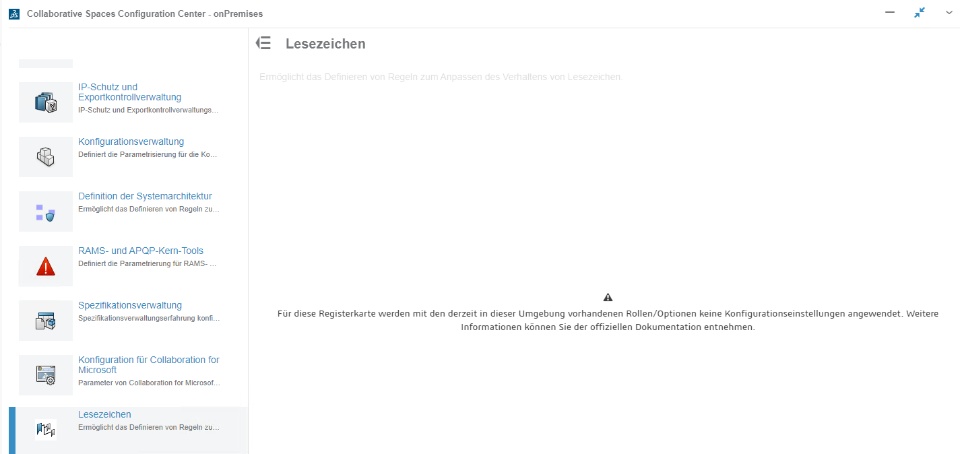 The settings in the Collaborative Spaces Configuration Center widget for the bookmarks are to be changed. The customer wants to be able to set the default values "in Work" or "draft". However, the following message appears: