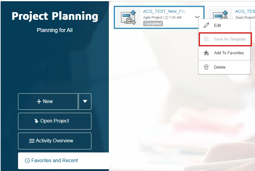 In ENOVIA Project Planning, I cannot use the “Save as Template” function for an agile project. In contrast to a Team Project or Enterprise Project, the function is “grayed out” for an agile project.