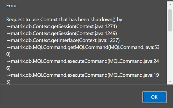 Once User login to the Enovia application, And popup window will display with "error 'Request to use Context that has been shutdown() by:"