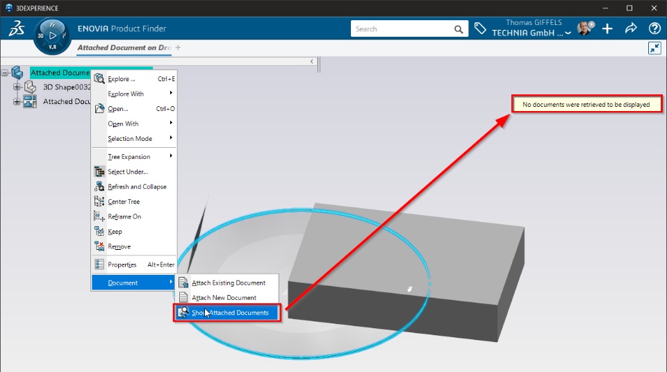 Szenario: Documents are attached to Physical Product in web app (e.g. Bookmark Editor) as Specification and as Attachement. When opening now the Physical Product in client Product Finde, you should be able to display these documents via "RMB > Document > Show Attached Documents" but message appears "No documents were retrieved to be displayed".