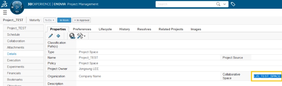 I thought that 1234_TEST_SPACE would also be displayed in [Project - Details - "Collaborative Space"]