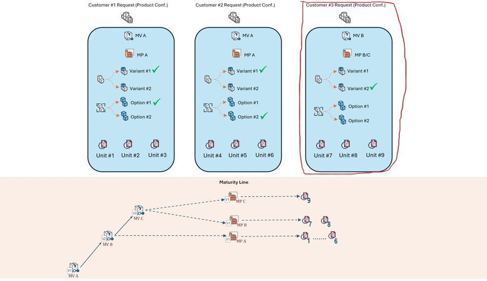 Figure 2: Customer requests and the relationship between MVs, MPs, and units