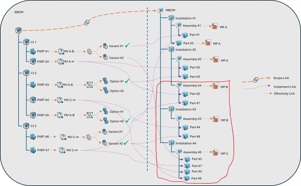 However, the issue with this method is that it allows you to filter the “Product Configuration” by Model Version, but referring back to “Figure 2”, Customer #3 has 2 Manufacturing Plans (MP B, and MP C), so filtering by product configuration does not yield a 100% MBOM, but rather an MBOM with both MP B and MP C, which shows (Assembly #3, Assembly #4, and Assembly #5) (refer to Figure 1).