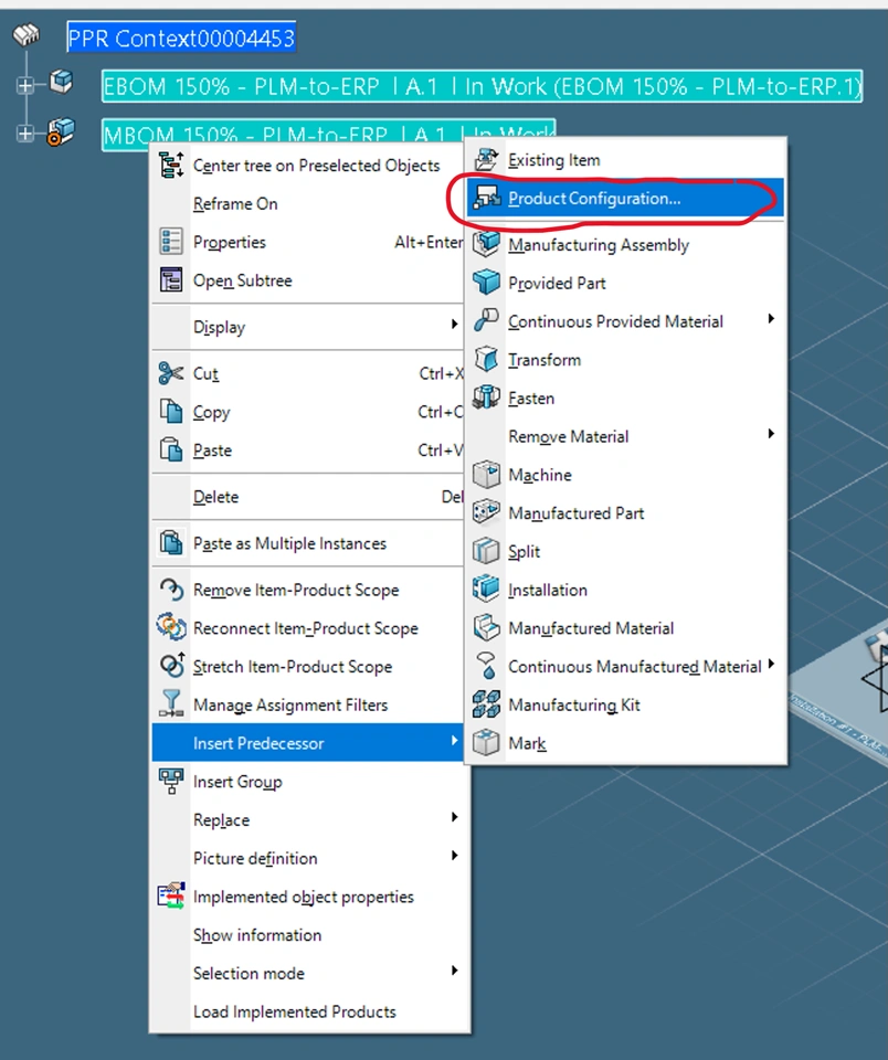 In this method, a new root node is created under the PPR, then we select the option “Insert Predecessor”, then “Product Configuration”, as can be seen in the figure below: