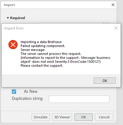 When I tried to import on another tenant I got this message from platform: ‘Business object’ does not exist Severity:3 Error code:1500127.