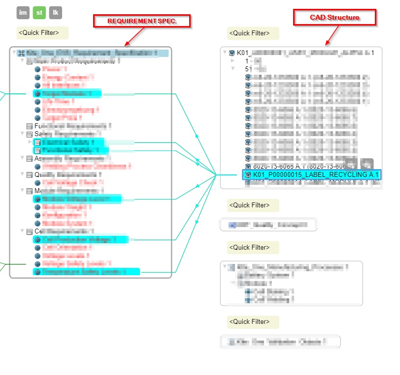 the requirement and traceability engineer links the requirements to the physical parts/products. After linking he can see all requirements which have to be fulfilled for a part/product inside traceability app (see example screenshot below).