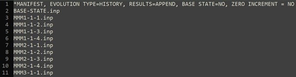 keyline1: *manifest keyword keyline2: base state of the model as an input file keyline3 to 50 : input files for different load cases