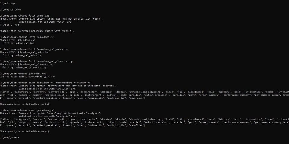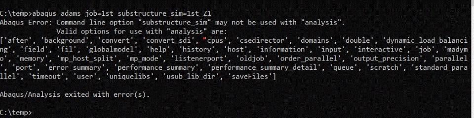 I am trying to convert a .sim file to a .mnf file using also the abaqus adams command. But I keep getting the same error: Command line option "substrucuture_sim" may not be used with "analysis" or Abaqus Error: Command line option "adams" may not be used with "analysis" as seen in the 2n picture. I am trying to follow the procedure explained in the 1st picture.