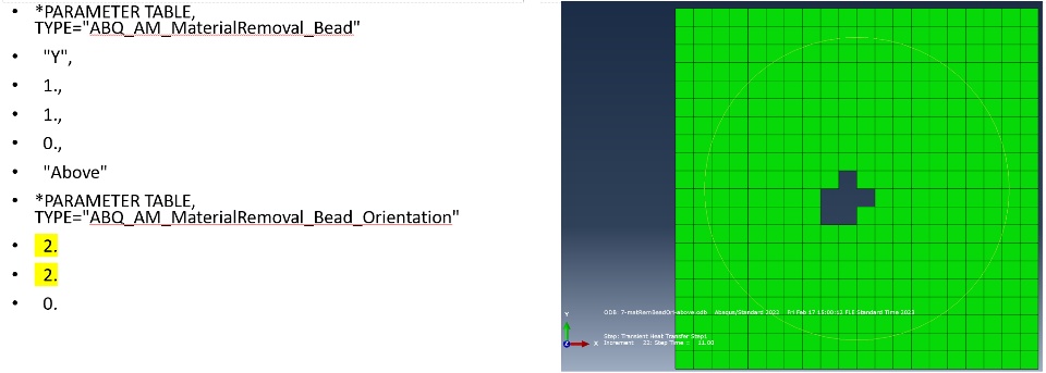 **---------------------------------------------------------------------- ** ABQ_AM_MaterialRemoval_Bead should be ** defined if Deposition Process is Bead **---------------------------------------------------------------------- *PARAMETER TABLE TYPE, NAME="ABQ_AM_MaterialRemoval_Bead", PARAMETERS = 5 STRING, ,"Stack Direction",, "X|Y|Z" FLOAT, ,"Bead Height",L,"Height of the bead deposition cross-section" FLOAT, ,"Bead Width",L,"Width of the bead deposition cross-section" FLOAT, ,"Activation Offset",L," " STRING, ,"Deposition Position",,"Below|Above|Middle" ** ABQ_AM_MaterialRemoval_Bead_Orientation can be ** to overwrite the preset staking direction defiend in ABQ_AM_MaterialRemoval_Bead **---------------------------------------------------------------------- *PARAMETER TABLE TYPE, NAME="ABQ_AM_MaterialRemoval_Bead_Orientation", PARAMETERS = 3 FLOAT,0,"Removal bead orientation x",L,"" FLOAT,0,"Removal bead orientation y",L,"" FLOAT,1,"Removal bead orientation z",L,""