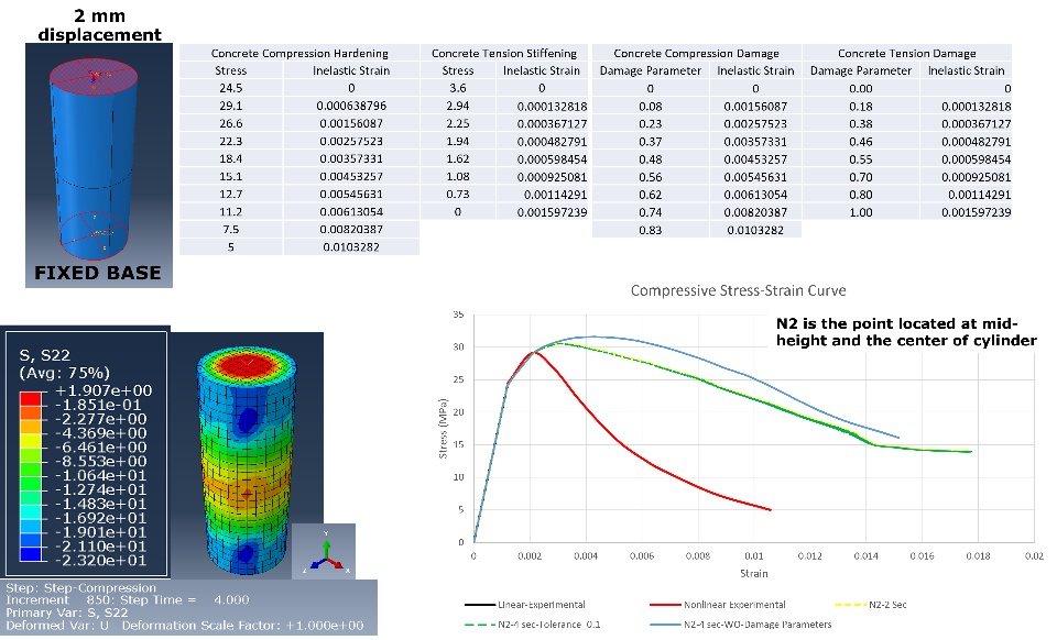 For a compression test, I modelled a concrete cylinder (diameter:150mm,height:375mm, fixed at the base). I applied 2 mm displacement under 2 sec and 4 sec separately, using dynamic implicit and explicit methods. The obtained results were the same. However, the problem is that the stress-strain curve of a concrete element does not follow the experimental stress-strain curve defined. I tried different analysis options that included decreasing tolerance by a scale factor of 0.1 in one case, using the CDP model without the compression and tension damage features in another case. Unfortunately, none of them fixed the problem of following the defined stress/strain curve.