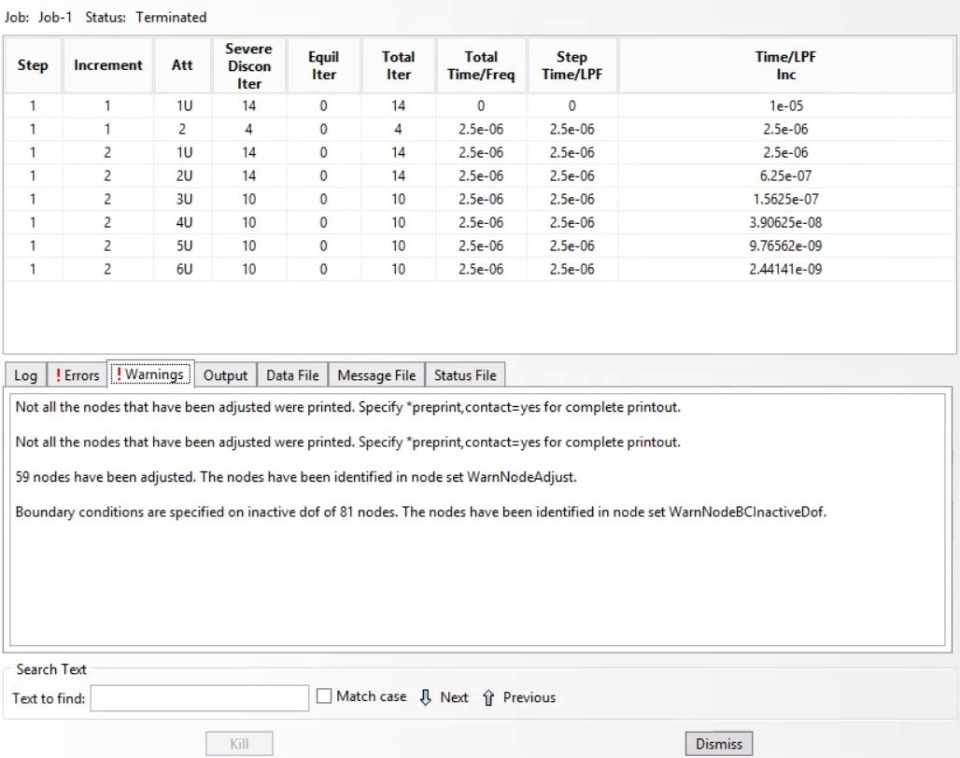 For step 1, I have the maximum number of increments of 1000, initial increment size of 1E-5, and minimum of increment size of 1E-20.