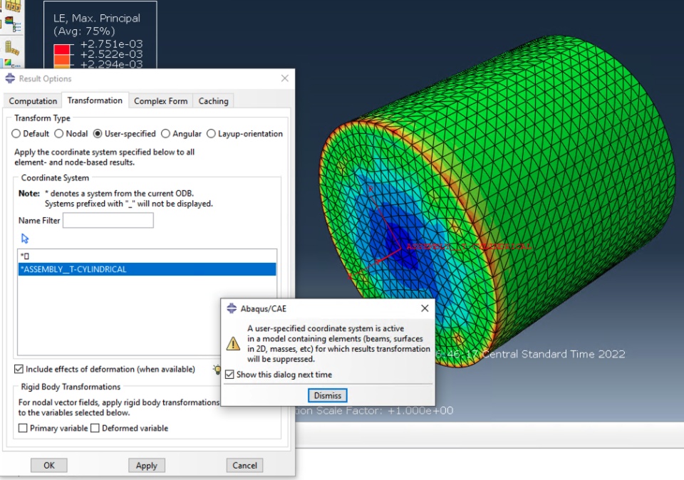 In Abaqus/Explicit 2021, I have created a cylindrical coordinate system for a cylinder for which I applied a rotational displacement (dynamic/explicit). I assign the cylindrical coordinate system in the boundary condition and after I run the problem I attempt to use the coordinate system for results: Result options->Transformation tab->User-specified->ASSEMBLY_T_CYLINDRICAL (which is the cylindrical system I created). However, when I select it and hit apply I get the following message: