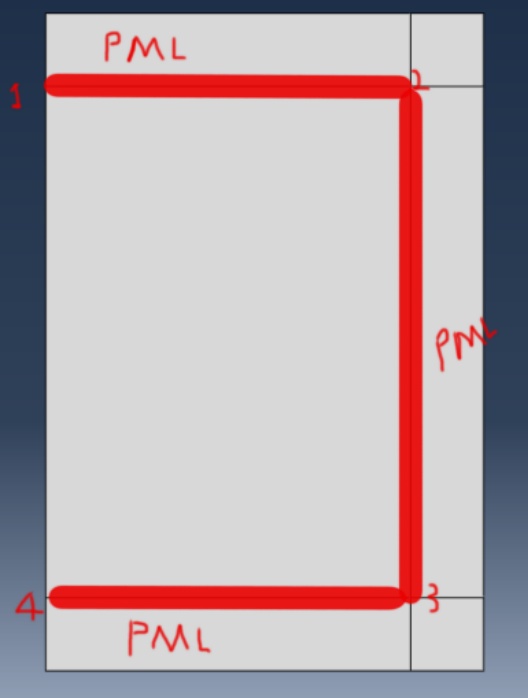 Hello there, I am trying to define a perfectly matched layer property in Abaqus for the model below. I keep running into errors saying "element # is not fully located in the prescribed PML domain". The model has a beam located between 1 and 4, then radiating into the acoustic domain.