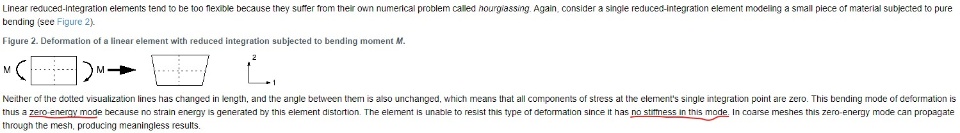 I am reading the Abaqus documentation (https://help.3ds.com/2021/english/dssimulia_established/SIMACAEGSARefMap/simagsa-c-ctmreduced.htm?contextscope=all&id=edeb6f07bacb4bee8bd759fafe34c490) to solve an hourglassing issue in my model. The explanation of shear-locking and why it happens makes sense physically, but I am having some difficulty understanding what is meant by a "zero-energy mode" and why does it not have a stiffness that makes it unable to resist deformation?