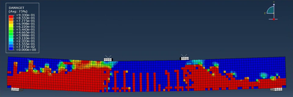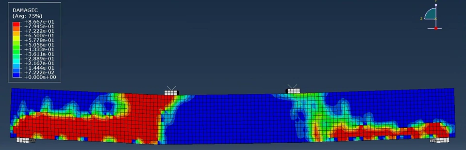 3) At the end of the analysis, the entire beam had cracks formed all over it. The result attached should indicate a beam that has been completely torn apart. which is not realistic and does not match with the experimental result. Even the compressive damage value is unrealistic.