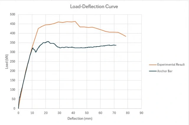 1) The load-deflection curve showed an earlier failure, approximately 100kN lower in ultimate strength, of the beam.