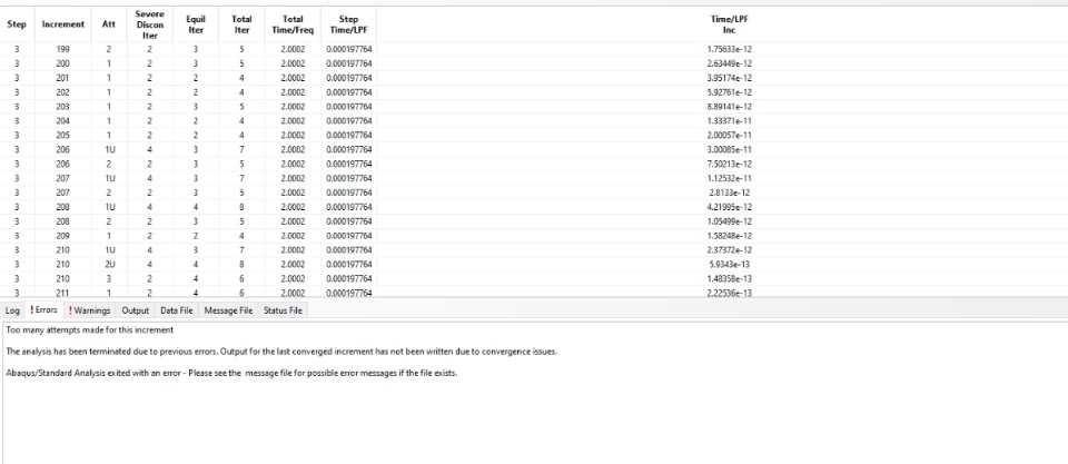 While running the analysis it is again and again saying too many attempts made for this increement. Also it is showing covergence issues. I have many times changed the mesh size but the error remains the same. Anyone please can explain what to do ??